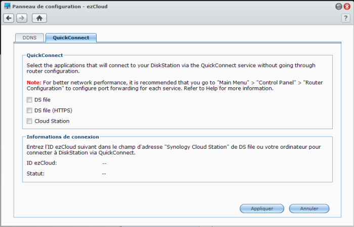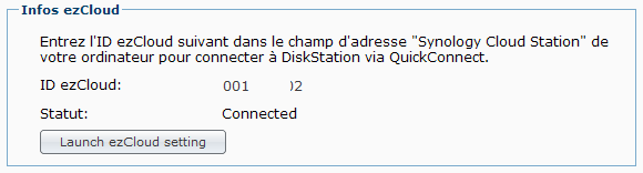 L’onglet QuickConnect affiche alors un ID ezCloud (pas besoin de le noter pour le moment) ainsi qu’un statut Connected :