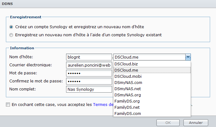 Je vais donc détailler la mise en place du service Cloud Station de Synology ainsi que son utilisation sur un PC Windows7 (seul OS supporté à ce jour… par l’application, pas par moi hein 😉 ). A noter que Synology a mis un nouveau service en place : MyDS Center qui vous permet de relier votre NAS au portail de Synology. Ainsi votre NAS remonte ses infos (adresse IP à Synology) et Synology fait en sorte que le nom DNS qui vous est attribué pointe sur votre NAS. Un ID vous sera également fournit pour une connexion rapide au NAS grâce à ce dernier. C’est le point que j’aimerais pouvoir squizzer à terme, me passer du lien avec Synology d’autant qu’ayant une adresse IP fixe, j’ai déjà un nom personnalisé pour chez moi. Au cours de l’installation j’ai cru que cela était possible mais n’y suis pas parvenu…. bug dans la bêta ? En tous les cas j’ai remonté mon avis chez Synology 😉
