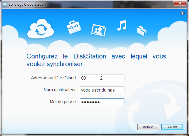 Là il vous faudra entrer l’ID que le Cloud Station vous a remit précédemment. Je n’ai pas réussi autrement qu’avec cet ID 🙁