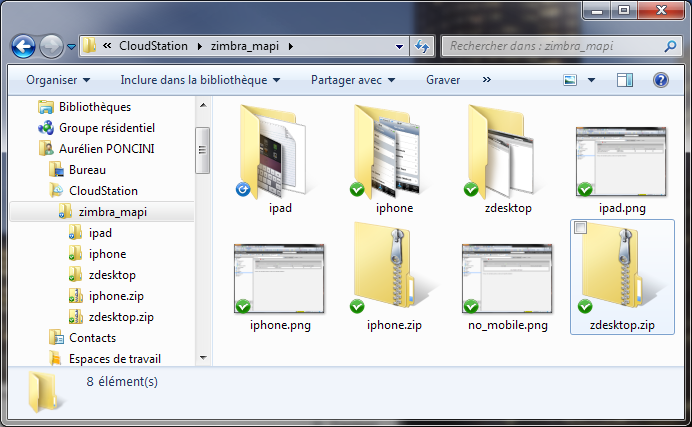 Un coup d’oeil sur notre dossier et on voit bien les dossiers cochés en vert, terminés et les dossiers en flèches bleu qui sont en cours de synchronisation :