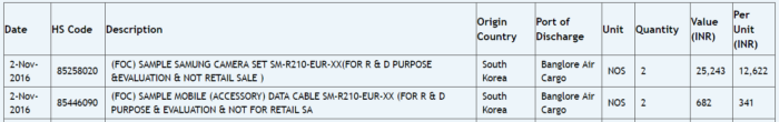 Malheureusement, le listing de l’importateur ne donne pas beaucoup d’informations sur la caméra, autre que c’est un ensemble de caméras, greffé avec le numéro modèle SM-R210. Le listing indique également que l’appareil a été amené dans la région à des « fins de R et D ».