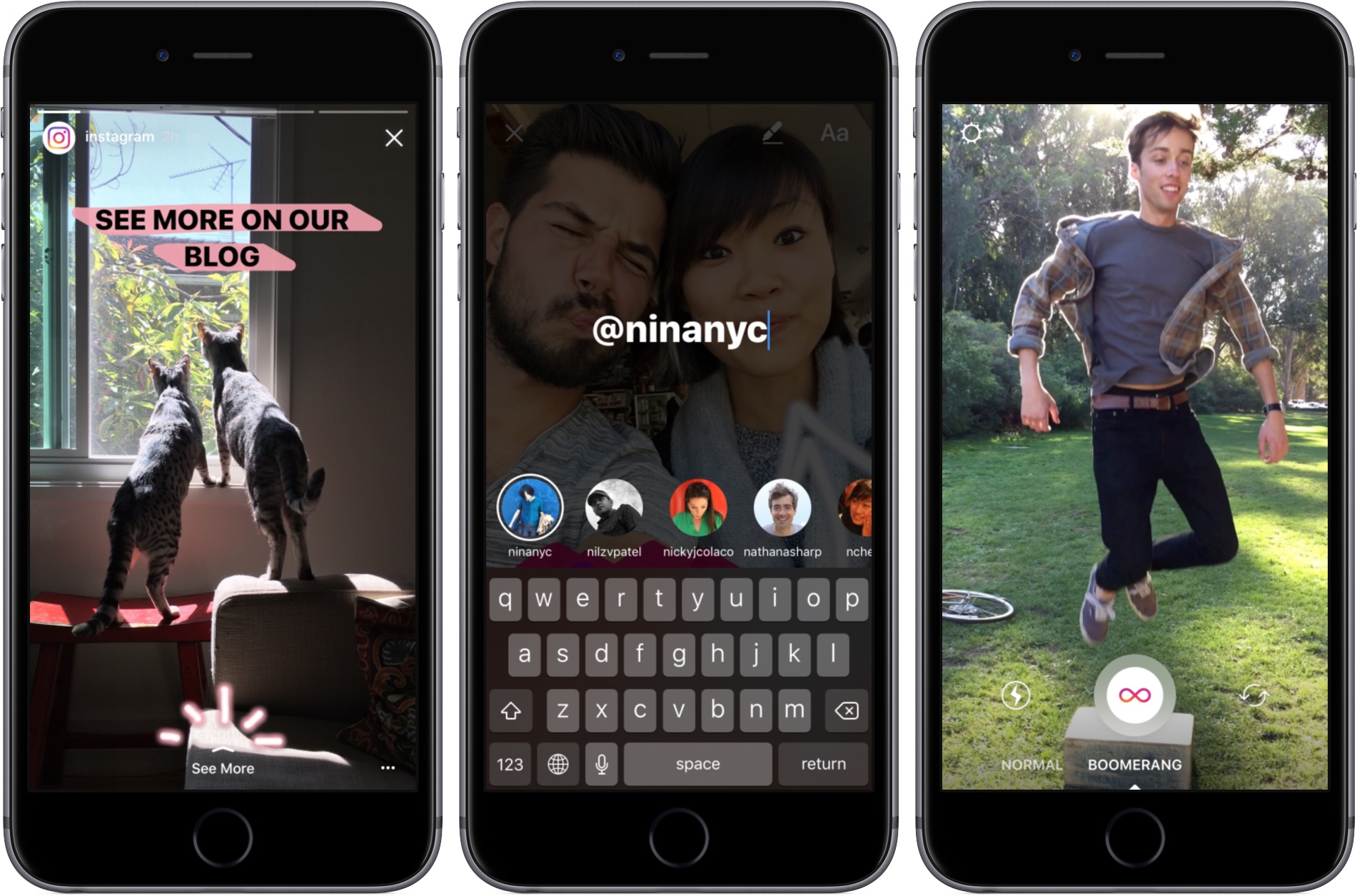 Peut-être que la plus grande nouveauté est la possibilité d’ajouter des liens vers des Stories qui peuvent être consultés par les utilisateurs sans quitter Instagram. De plus, les utilisateurs peuvent désormais mentionner quelqu’un d’autre dans une story, et ils peuvent créer un Boomerang directement à partir de l’application Instagram.