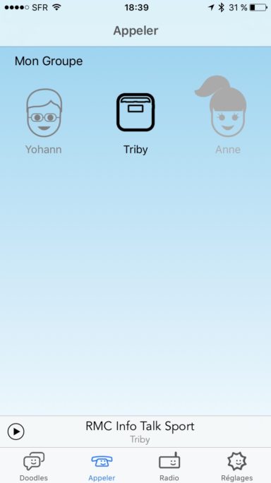 En dehors de la messagerie et des appels, l’application Triby vous permet également d’utiliser l’enceinte connectée en une radio personnalisée. Le Triby est capable de gérer les stations de radio les plus populaires depuis l’application. Tout comme les appels, on peut attribuer une radio à un bouton de radio, et une seconde au second bouton. Et, une liste de radio sera accessible par le bouton avec les petits points. Quand on appuie sur ce petit bouton à points, la liste s’affiche sur l’écran du Triby et il faut réappuyer sur le même bouton pour sélectionner la radio désirée. La programmation des radios est très simple depuis l’application. On recherche sa station et on lui attribue un bouton. La programmation des appareils appelés également.