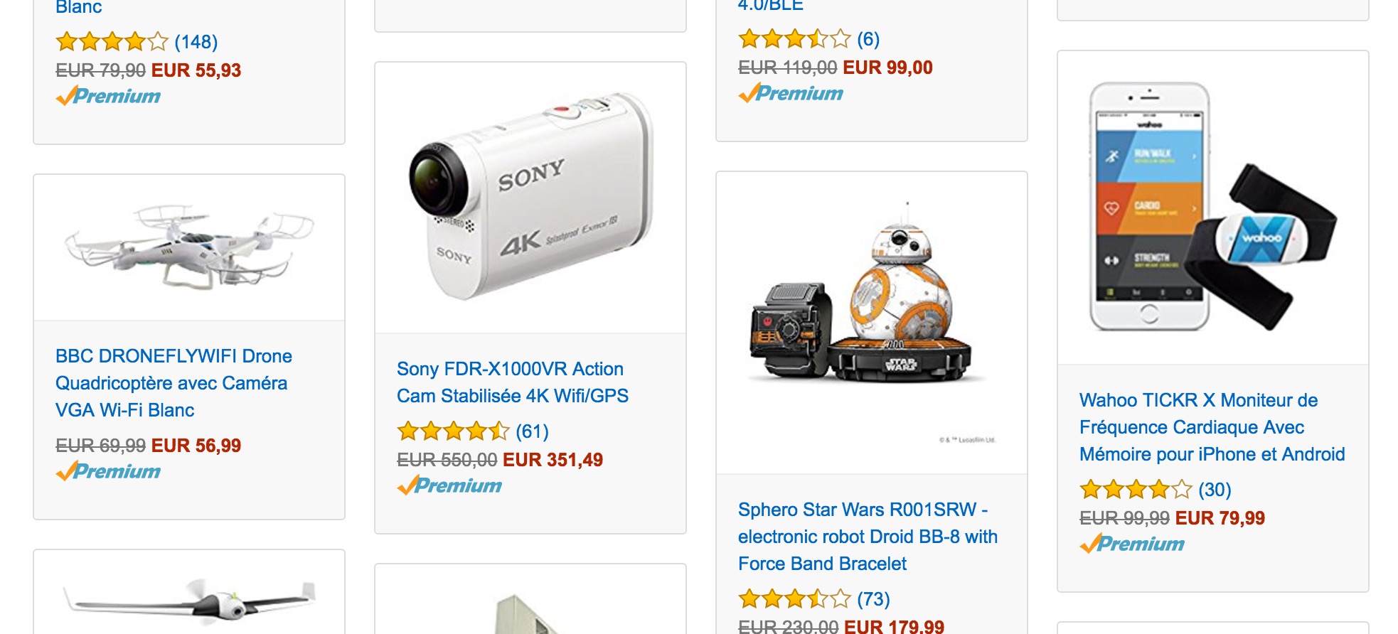 Ceux qui veulent un drone, voici le YUNFCAEU. Vendu 429,90 euros, ce quadricoptère embarque une caméra embarquée 4K, et a une portée de 80 m. Il est compatible iOS et Android. Il y a aussi le célèbre Bebop 2 de Parrot, dont le pack proposé contient le drone, une paire de lunettes FPV et le Skycontroller pour smartphone et tablette. Il est vendu 499 euros, contre 699 euros jusqu’ici. L’aile volante de Parrot, le DISCO, livrée avec un Skycontroller 2 et des lunettes, est également vendue sur Amazon au prix de 1 199 euros (1 299 euros).