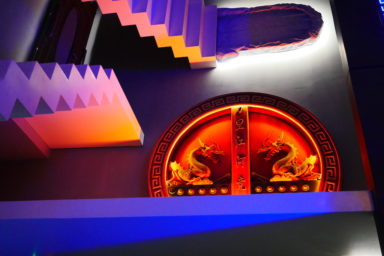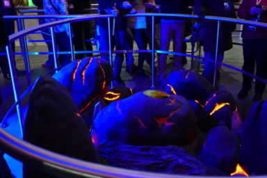 Ensuite vient le choix du bâtiment. Celui-ci se porte le pavillon du « Tapis Magique », qui ressemble à un orgue imaginaire, où un bouquet de fibres optiques se dressent en colonnes, symbole de la communication. Là encore, des travaux titanesques pour retirer l’énorme plancher de verre par le toit. Jusqu’en juin 2016, les équipes du parc ont réussi à loger la plate-forme basculante dans une fosse de 28 mètres, et installé l’écran torique d’une surface globale de 600 m2.