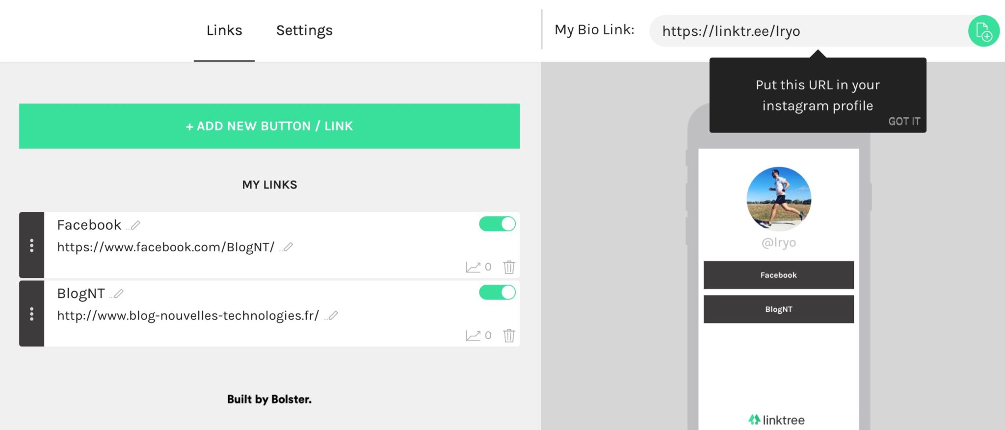 Comment ce dernier fonctionne est assez simple. Après avoir connecté Linktree à votre profil Instagram, vous recevrez un lien unique à placer dans votre bio Instagram. Une fois que le lien est en place, vous pouvez personnaliser ce qui est affiché depuis votre navigateur, que ce soit pour un seul site Web, ou une collection de sites que vous cherchez présenter à vos abonnés.