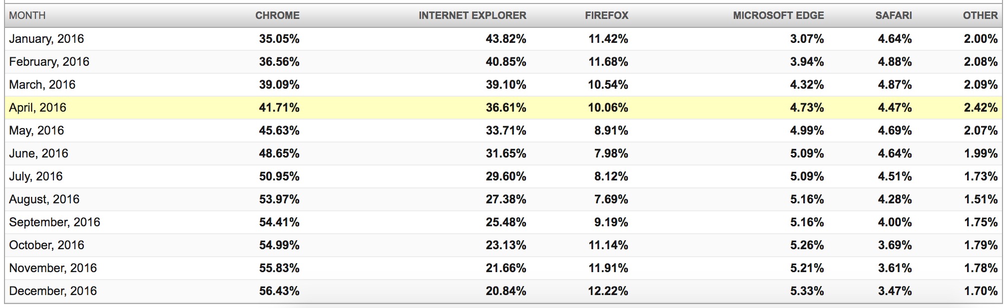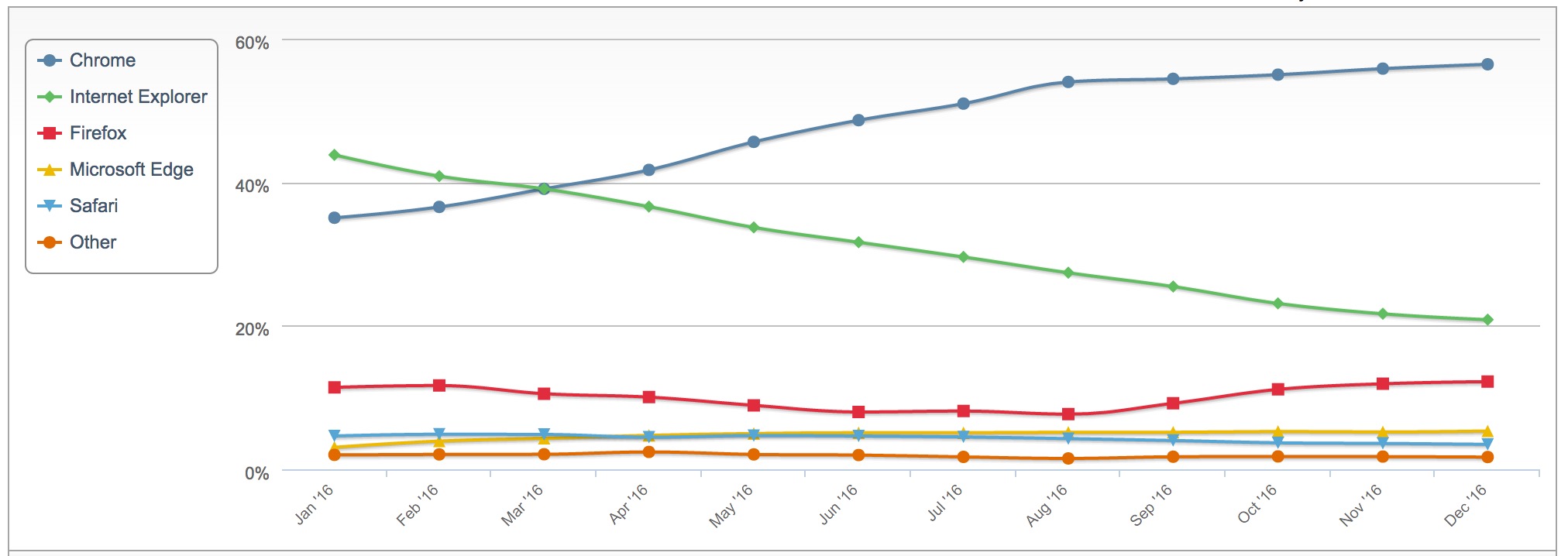 Alors que l’année 2016 vient de prendre fin, laissant place à une année 2017 très passionnante, on peut néanmoins tirer une conclusion sur le développement de l’activité du navigateur. Bien qu’intéressantes, les conclusions ne sont pas réellement surprenantes, puisque même au mois de décembre, la tendance a continué. Chrome a continué à grimper, Microsoft Edge stagne sensiblement et Internet Explorer diminue, mais a encore une forte part de marché.