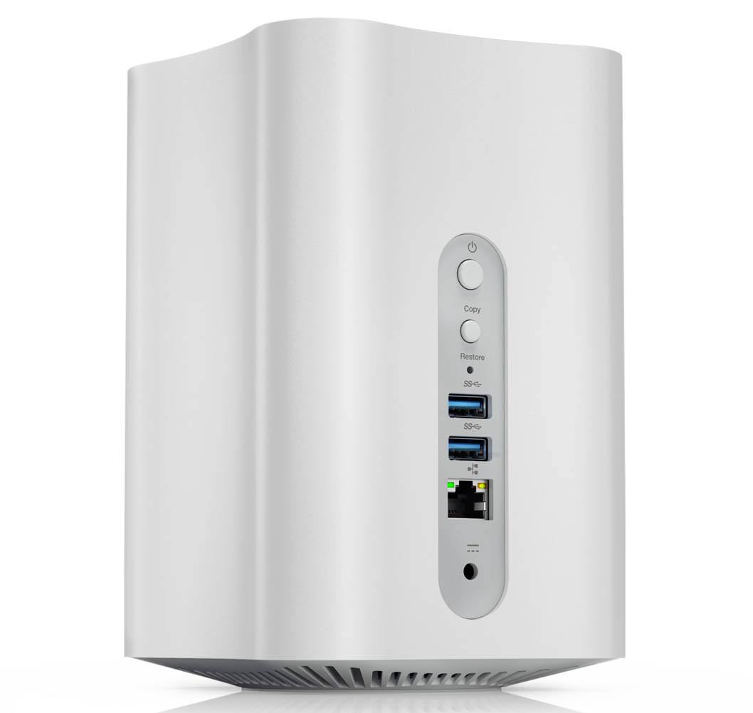 La conception est très intéressante, avec un châssis en position verticale qui est beaucoup plus attrayant à regarder que la plupart des NAS sur le marché. Comme mentionné précédemment, il dispose d’un accès sans fil double bande, ainsi que des ports Ethernet et USB 3.0. Sous le capot, on retrouve également un processeur double-cœurs Intel Celeron cadencé à 1,6 GHz, couplé à 2 Go de mémoire vive (RAM).